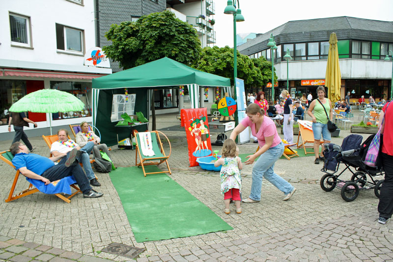 Auf einem grünen Kunstrasenteppich waren bunte Liegestühle und Sonnenschirme aufgestellt, auf denen die Innenstadtbesucher dankbar Platz nahmen, um ein bisschen zu "verschnaufen" zwischen den Einkäufen. Für Kinder standen ein Plantschbecken und eine kleine Sandkiste mit Spielsachen bereit, die innerhalb weniger Minuten begeistert belagert wurden. Ein besonderer Anziehungsmagnet war auch der Pavillion mit Glücksrad, wo Groß und Klein sommerliche Preise erdrehen konnten. Das RVR Lufthansa Reisebüro reichte leckere Cocktails und Astrid Weiter von der Schatzinsel kleine Becher mit köstlichem Radevormwalder Früchtetee. Auch die anderen Aktionen der Einzelhändler, wie z.B. die Wasserbombenschlacht vom Mortimer English Club und die Eisverteil-Aktion von Optik Strunk kamen bei den Kunden sehr gut an. Auch das Wetter spielte mit und schenkte hin und wieder sogar Sonnenstrahlen - zumindest blieb es aber trocken.